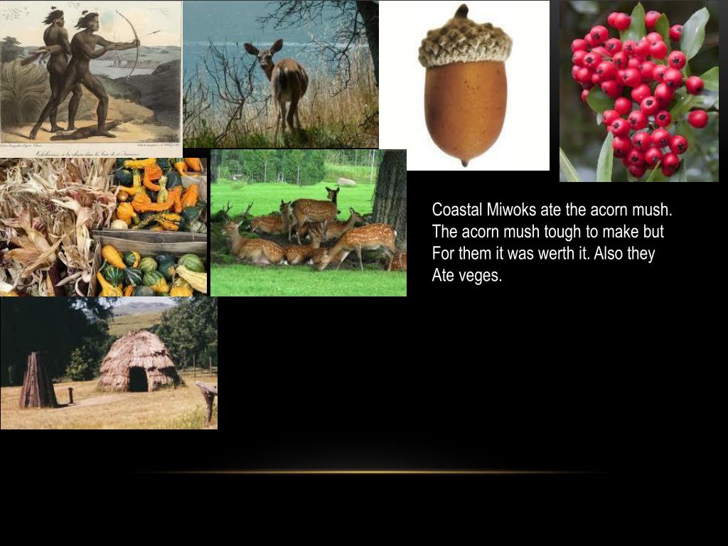Coastal Miwoks ate the acorn mush. The acorn mush tough to make but For them it was werth it. Also they Ate veges.