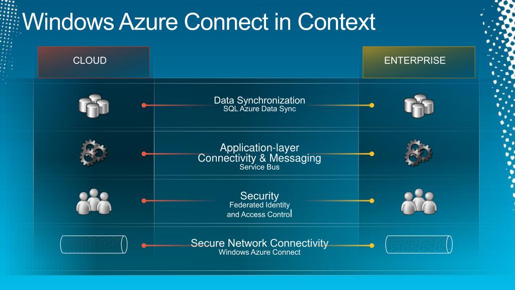 Windows Azure Connect in Context CLOUD ENTERPRISE Data Synchronization SQL Azure Data Sync Application-layer Connectivity & Messaging Service Bus Security Federated Identity and Access Control Secure Network Connectivity Windows Azure Connect