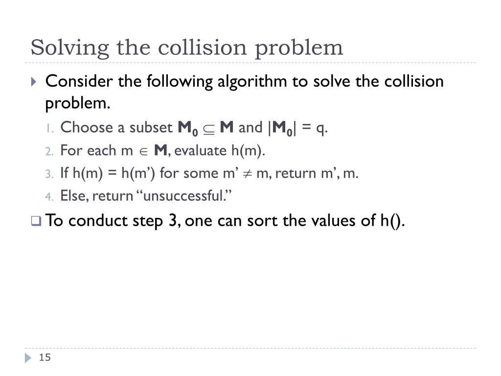 Solving the collision problem • Consider the following algorithm to solve the collision problem. • Choose a subset M0 M and|M0| = q. • For each m M, evaluate h(m). • If h(m) = h(m’) for some m’ m, return m’, m. • Else, return “unsuccessful.” • To conduct step 3, one can sort the values of h().