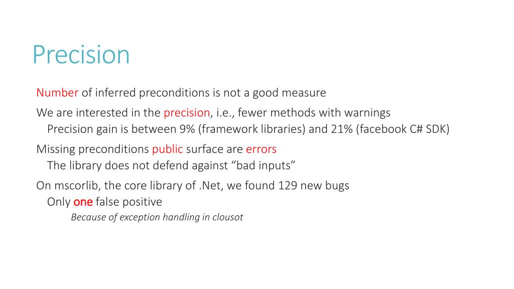 Precision • Number of inferred preconditions is not a good measure • We are interested in the precision, i.e., fewer methods with warnings • Precision gain is between 9% (framework libraries) and 21% (facebook C# SDK) • Missing preconditions public surface are errors • The library does not defend against “bad inputs” • On mscorlib, the core library of .Net, we found 129 new bugs • Only one false positive Because of exception handling in clousot