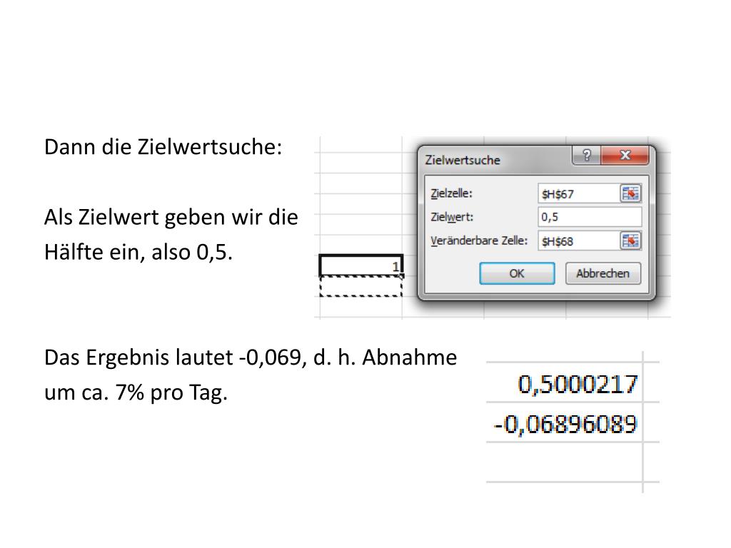 Dann die Zielwertsuche: Als Zielwert geben wir die Hälfte ein, also 0,5. Das Ergebnis lautet -0,069, d. h. Abnahme um ca. 7% pro Tag.