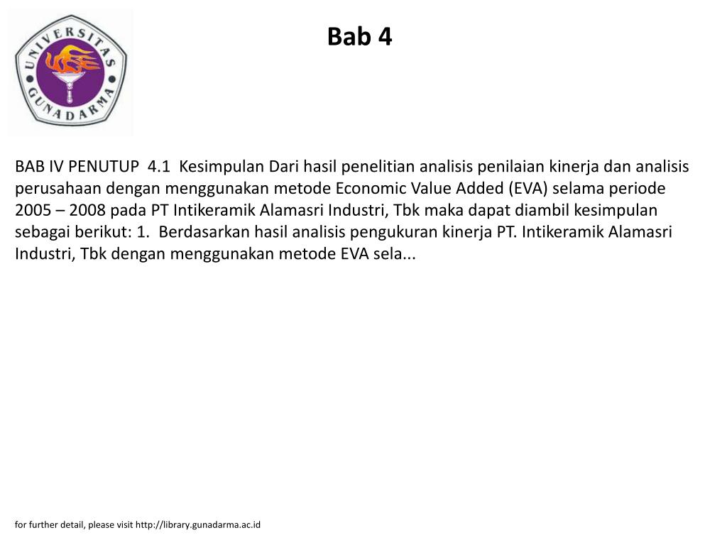 Bab 4 • BAB IV PENUTUP 4.1 Kesimpulan Dari hasil penelitian analisis penilaian kinerja dan analisis perusahaan dengan menggunakan metode Economic Value Added (EVA) selama periode 2005 – 2008 pada PT Intikeramik Alamasri Industri, Tbk maka dapat diambil kesimpulan sebagai berikut: 1. Berdasarkan hasil analisis pengukuran kinerja PT. Intikeramik Alamasri Industri, Tbk dengan menggunakan metode EVA sela... • for further detail, please visit http://library.gunadarma.ac.id