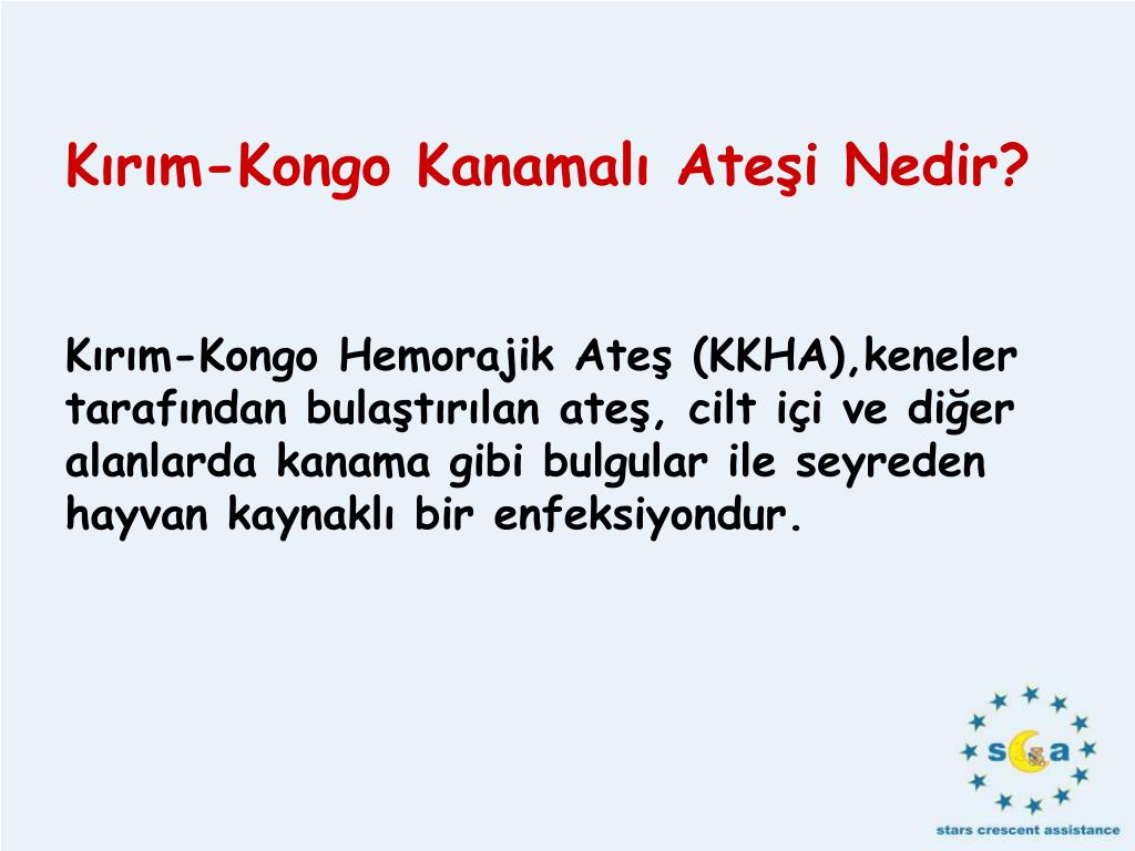KIRIM-KONGO KANAMALI ATEŞİ. Mayıs 2008. Kırım-Kongo Kanamalı Ateşi Nedir?. Kırım-Kongo Hemorajik Ateş (KKHA),keneler tarafından bulaştırılan ateş, cilt içi ve diğer alanlarda kanama gibi bulgular ile seyreden hayvan kaynaklı bir enfeksiyondur. KKKA VAK’ALARININ GÖRÜLDÜĞÜ AYLAR.