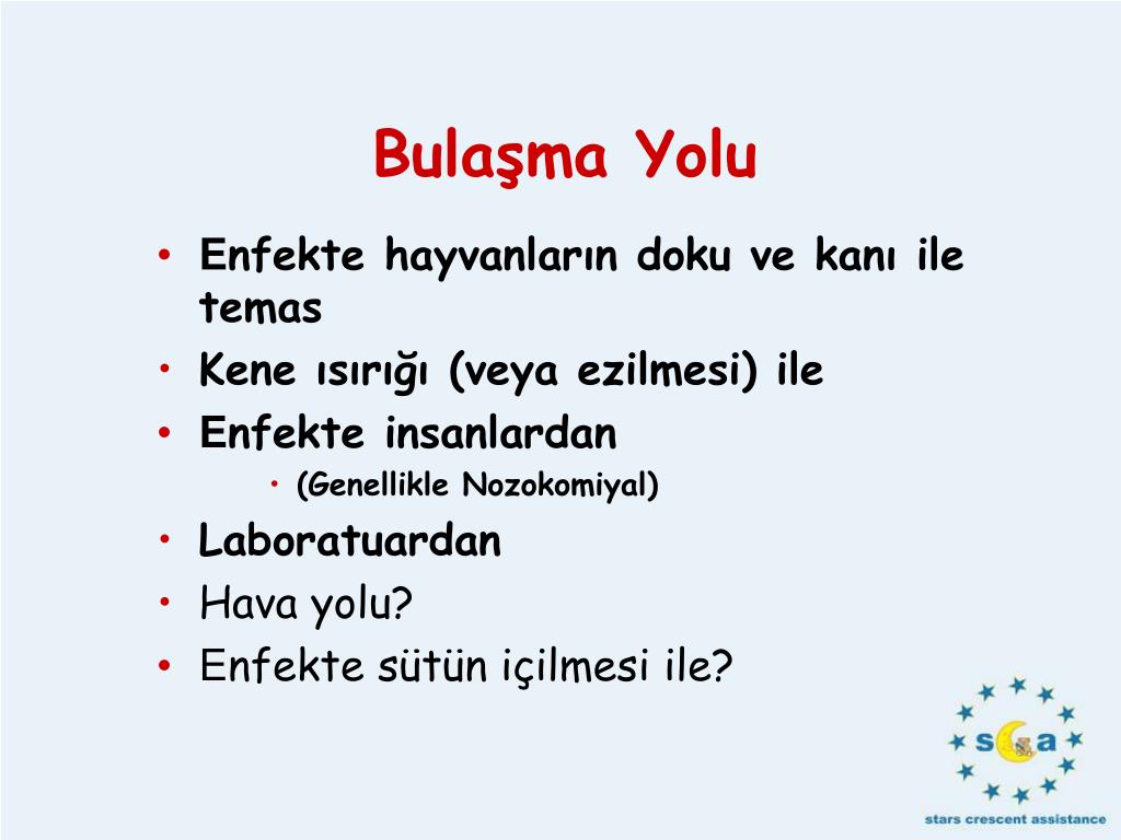 Bulaşma Yolu • Enfekte hayvanların doku ve kanı ile temas • Kene ısırığı (veya ezilmesi) ile • Enfekte insanlardan • (Genellikle Nozokomiyal) • Laboratuardan • Hava yolu? • Enfekte sütün içilmesi ile?