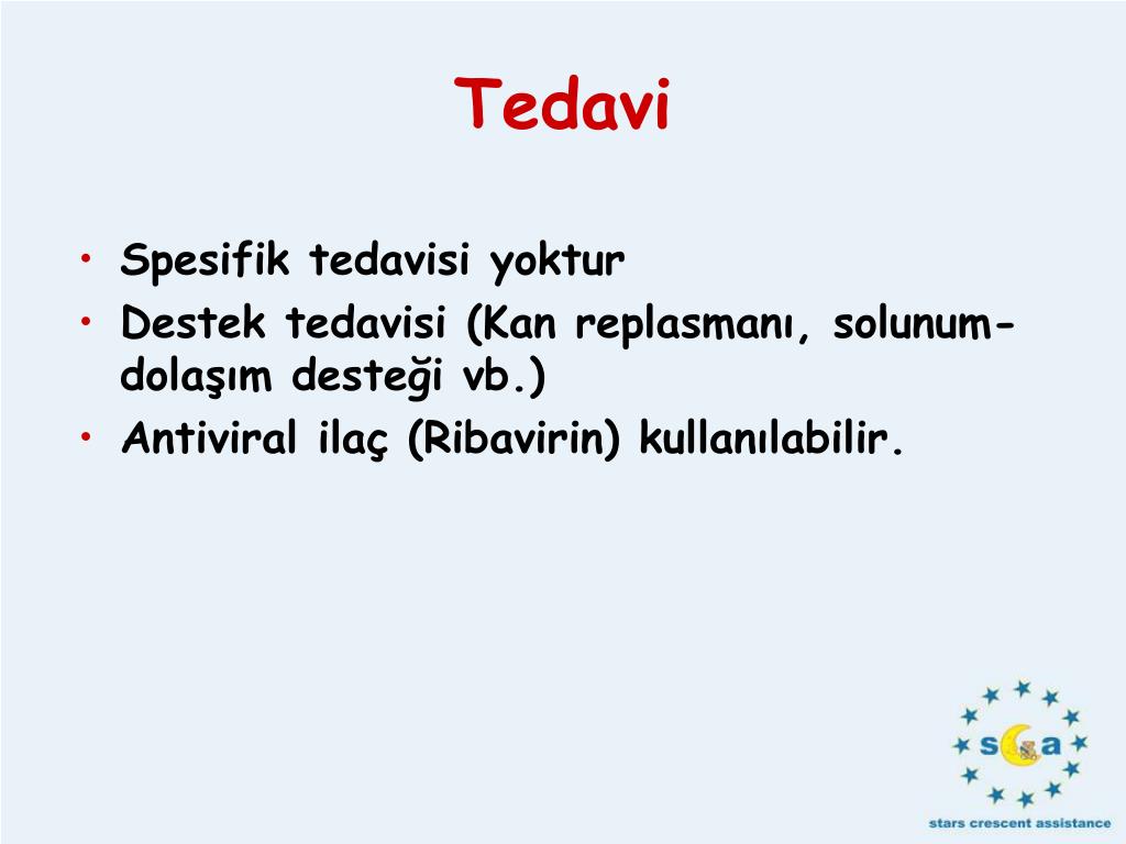 Tedavi Spesifik tedavisi yoktur Destek tedavisi (Kan replasmanı, solunum-dolaşım desteği vb.) Antiviral ilaç (Ribavirin) kullanılabilir.
