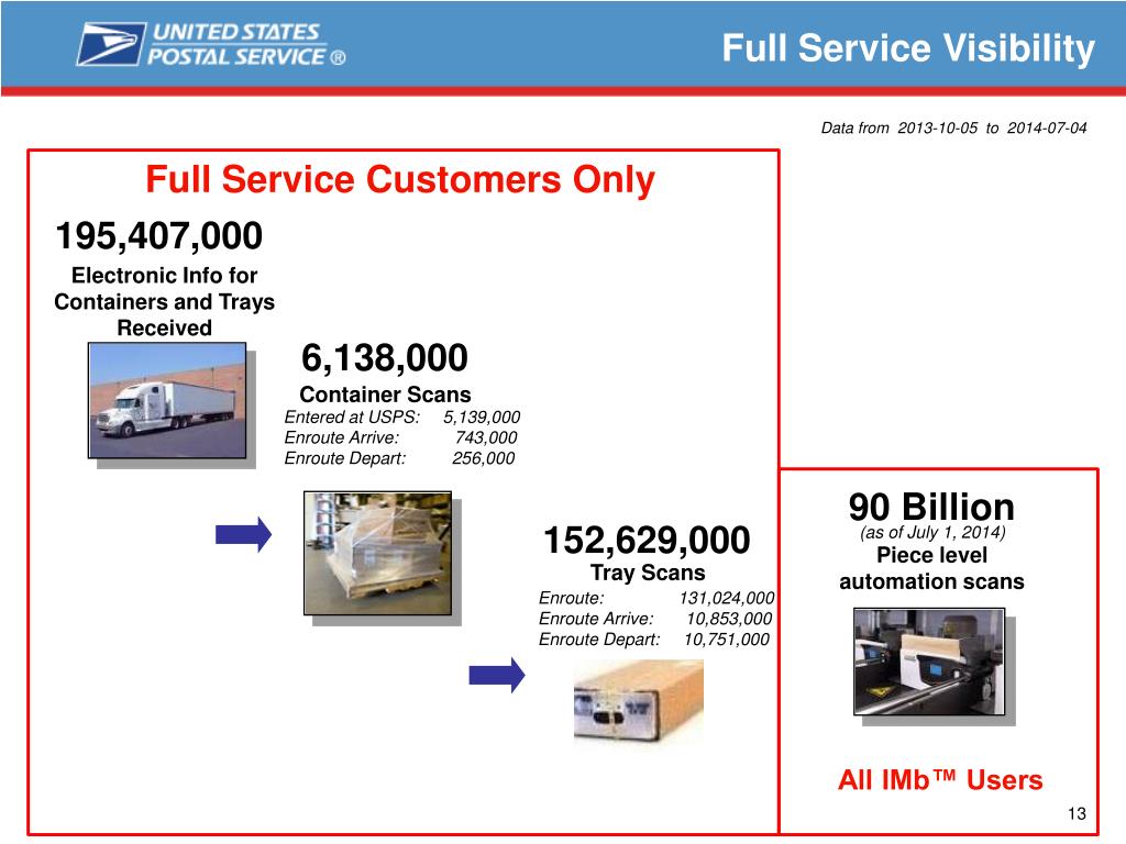 Full Service Visibility • Data from 2013-10-05 to 2014-07-04 Full Service Customers Only 195,407,000 Electronic Info for Containers and Trays Received 6,138,000 Container Scans Entered at USPS: 5,139,000 Enroute Arrive: 743,000 Enroute Depart: 256,000 90 Billion 152,629,000 (as of July 1, 2014) Piece level automation scans Tray Scans Enroute: 131,024,000 Enroute Arrive: 10,853,000 Enroute Depart: 10,751,000 All IMb™ Users