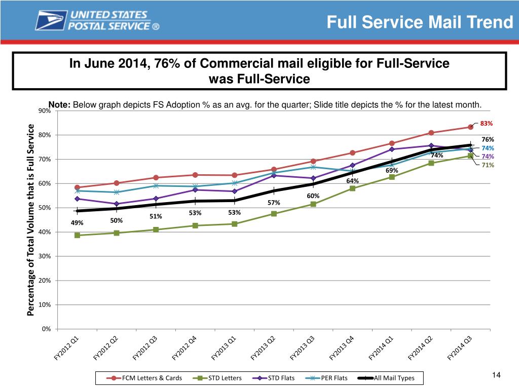 Full Service Mail Trend • In June 2014, 76% of Commercial mail eligible for Full-Service • was Full-Service Note: Below graph depicts FS Adoption % as an avg. for the quarter; Slide title depicts the % for the latest month.