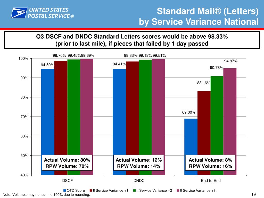 Standard Mail® (Letters) by Service Variance National Q3 DSCF and DNDC Standard Letters scores would be above 98.33% (prior to last mile), if pieces that failed by 1 day passed 19 Note: Volumes may not sum to 100% due to rounding.
