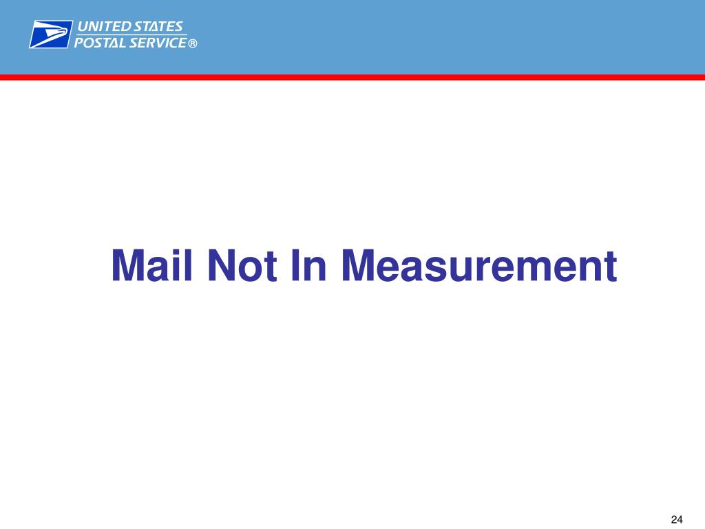 Mail Not In MeasurementExclusion Reason Overview 1 2 3 Lack of, or inconsistent mail visibility data Discrepancy in eDoc Preparation: eDoc are evaluated against business rules and operational data to determine if mail should be excluded. Discrepancy in Mail Preparation: Operational data points collected during mail acceptance, induction, and/or processing are evaluated to determine if mail should be excluded. • No Container Unload Scan or FAST Appointment (Start-the-Clock) • No Piece Scan (Stop-the-Clock) • Stop scan observed before Start-the-Clock (Logical mailings) • Business rules (e.g. Full Service compliance check for unique barcode) • USPS operational data (e.g. FAST Appointments, SV Unload Scans) • Acceptance: Manual or MERLIN PBV Verification Failures • Induction: Irregularities captured in FAST or SV • Processing: Change of Address (COA), Undeliverable as Addressed (UAA), Invalid Delivery Point (DPV). The measurement system detects the above scenarios and automatically excludes the appropriate mail from measurement. Three main categories of reasons why Full Service mail can be excluded from service measurement: