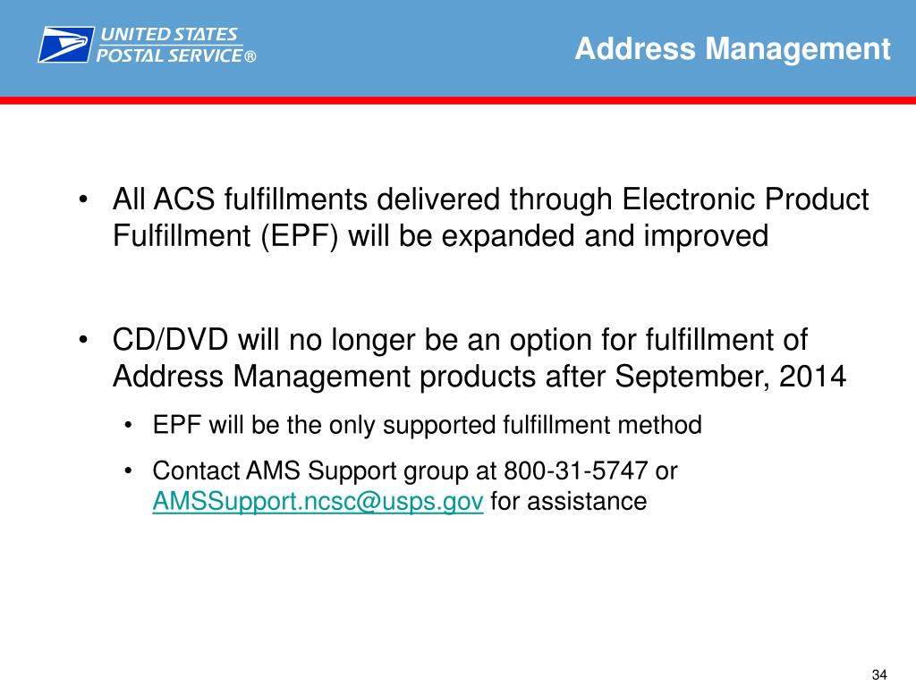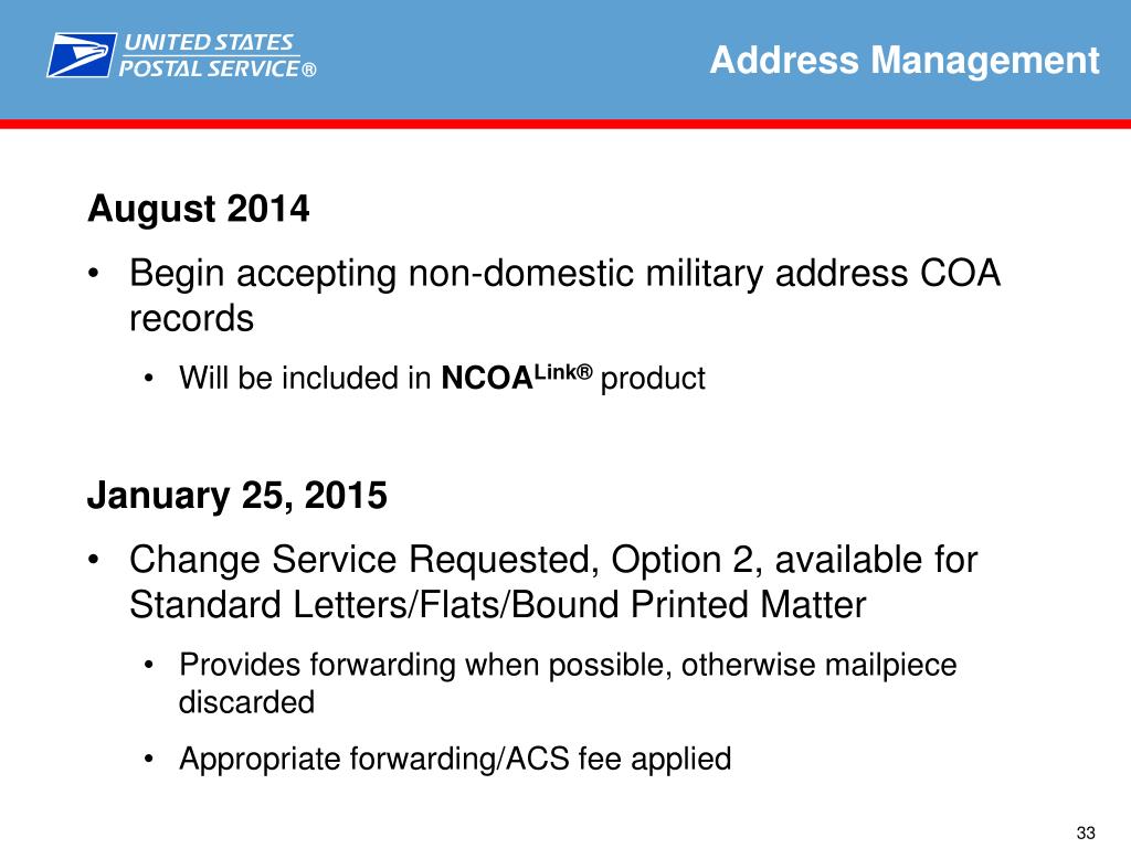 Address Management August 2014 • Begin accepting non-domestic military address COA records • Will be included in NCOALink® product January 25, 2015 • Change Service Requested, Option 2, available for Standard Letters/Flats/Bound Printed Matter • Provides forwarding when possible, otherwise mailpiece discarded • Appropriate forwarding/ACS fee applied 33