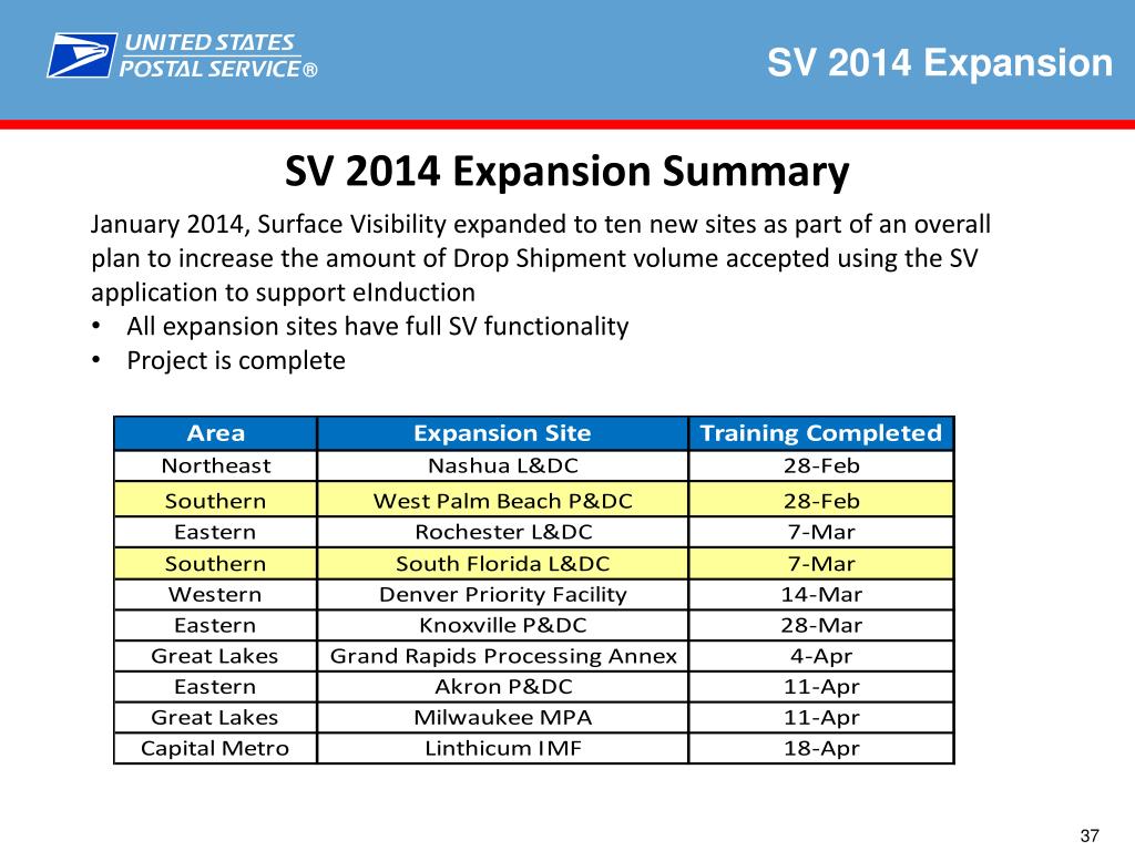 SV 2014 Expansion SV 2014 Expansion Summary • January 2014, Surface Visibility expanded to ten new sites as part of an overall plan to increase the amount of Drop Shipment volume accepted using the SV application to support eInduction • All expansion sites have full SV functionality • Project is complete 37