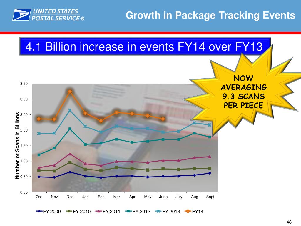 Growth in Package Tracking Events 4.1 Billion increase in events FY14 over FY13 NOW AVERAGING 9.3 SCANS PER PIECE 48