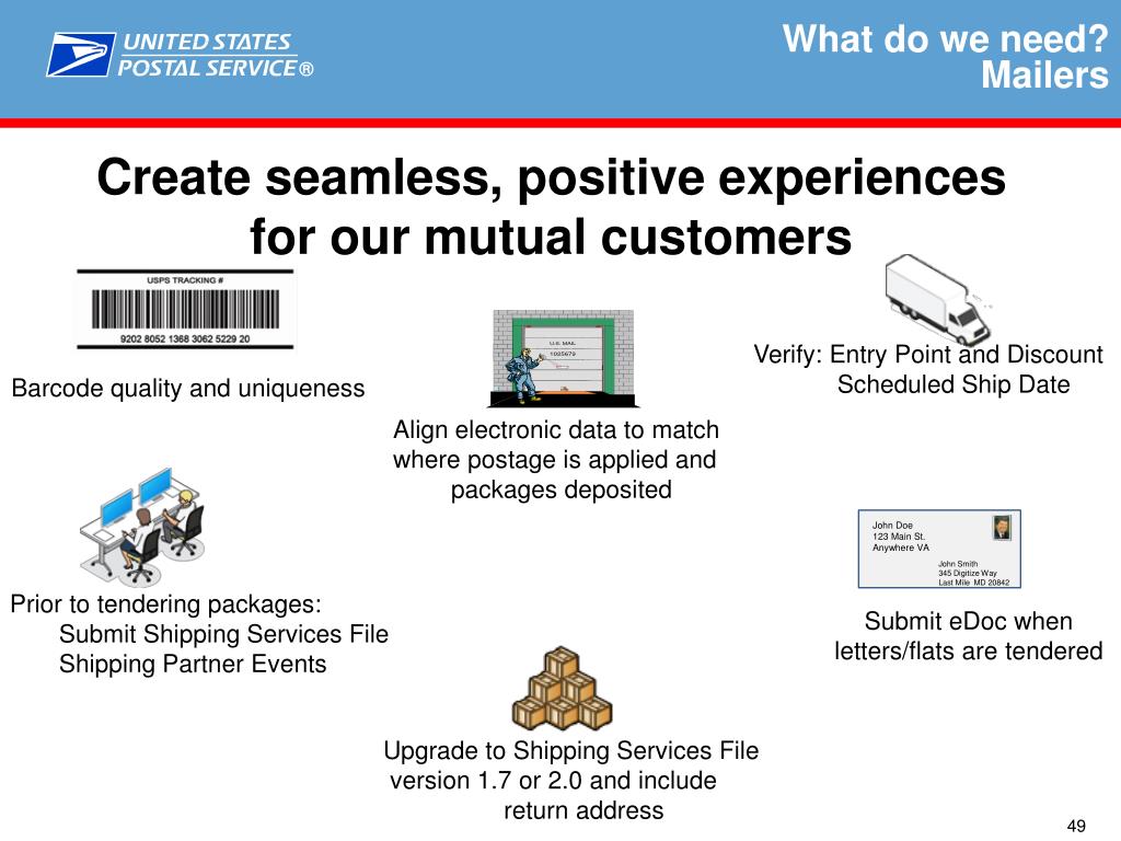 What do we need? Mailers John Doe 123 Main St. Anywhere VA John Smith 345 Digitize Way Last Mile MD 20842 Create seamless, positive experiences for our mutual customers • Verify: Entry Point and Discount • Scheduled Ship Date Barcode quality and uniqueness Align electronic data to match where postage is applied and packages deposited • Prior to tendering packages: • Submit Shipping Services File • Shipping Partner Events Submit eDocwhen letters/flats are tendered Upgrade to Shipping Services File version 1.7 or 2.0 and include return address 49