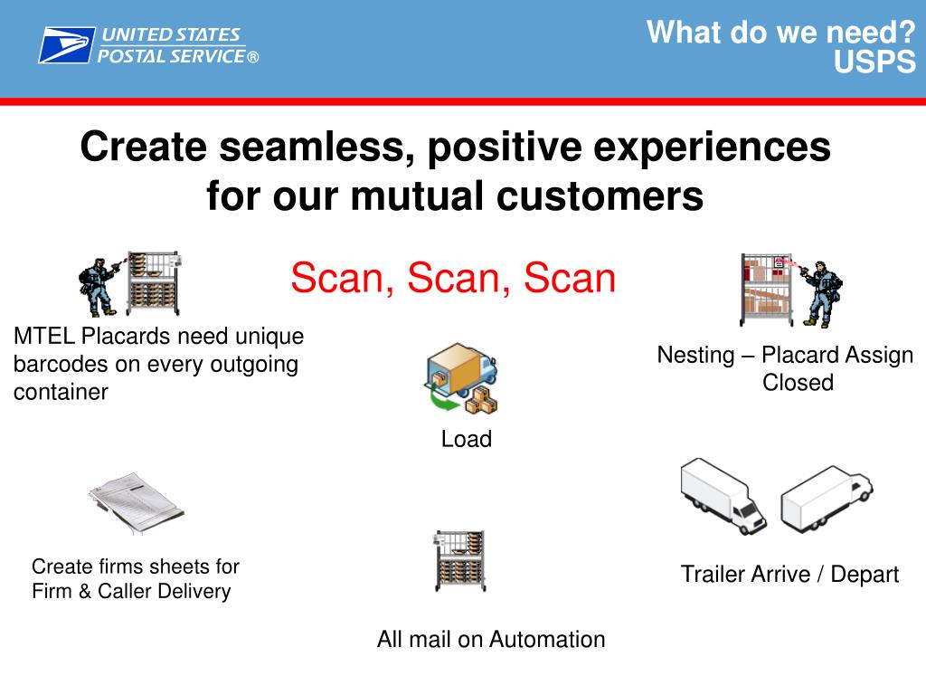 What do we need? USPS Create seamless, positive experiences for our mutual customers Scan, Scan, Scan • MTEL Placards need unique • barcodes on every outgoing • container Nesting – Placard Assign Closed Load Create firms sheets for Firm & Caller Delivery Trailer Arrive / Depart All mail on Automation