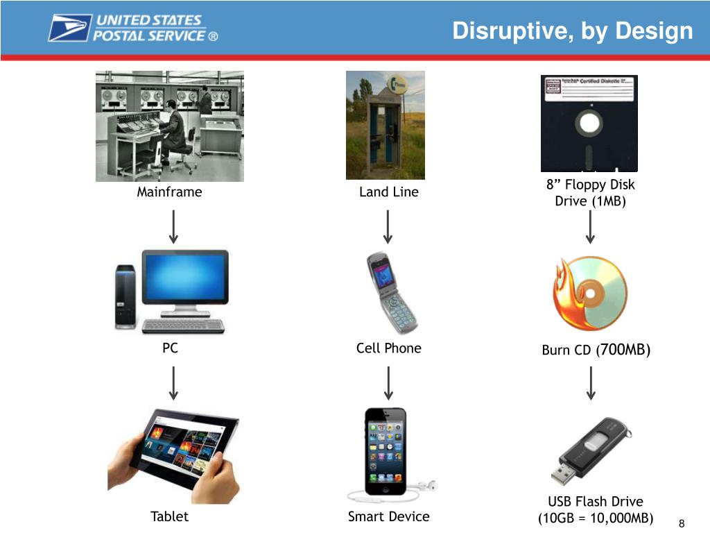 Disruptive, by Design 8” Floppy Disk Drive (1MB) Mainframe Land Line PC Cell Phone Burn CD (700MB) 01 USB Flash Drive (10GB = 10,000MB) Tablet Smart Device 8