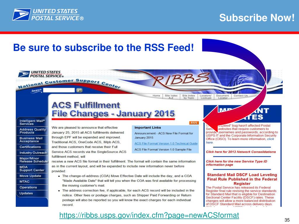Subscribe Now! Be sure to subscribe to the RSS Feed! https://ribbs.usps.gov/index.cfm?page=newACSformat 35