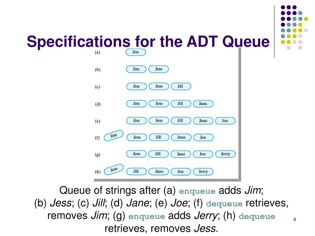 Specifications for the ADT Queue Queue of strings after (a) enqueue adds Jim; (b) Jess; (c) Jill; (d) Jane; (e) Joe; (f) dequeue retrieves, removes Jim; (g) enqueue adds Jerry; (h) dequeue retrieves, removes Jess.