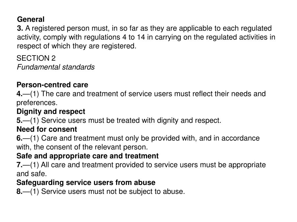 General 3. A registered person must, in so far as they are applicable to each regulated activity, comply with regulations 4 to 14 in carrying on the regulated activities in respect of which they are registered. SECTION 2 Fundamental standards Person-centred care 4.—(1) The care and treatment of service users must reflect their needs and preferences. Dignity and respect 5.—(1) Service users must be treated with dignity and respect. Need for consent 6.—(1) Care and treatment must only be provided with, and in accordance with, the consent of the relevant person. Safe and appropriate care and treatment 7.—(1) All care and treatment provided to service users must be appropriate and safe. Safeguarding service users from abuse 8.—(1) Service users must not be subject to abuse.
