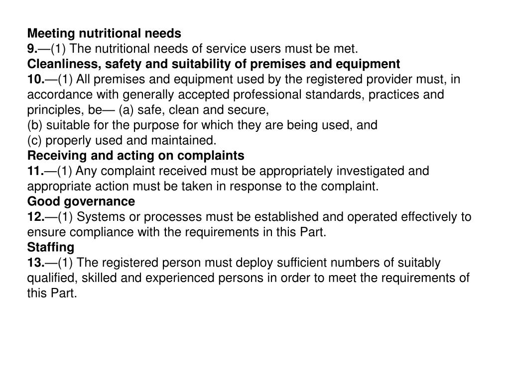 Meeting nutritional needs 9.—(1) The nutritional needs of service users must be met. Cleanliness, safety and suitability of premises and equipment 10.—(1) All premises and equipment used by the registered provider must, in accordance with generally accepted professional standards, practices and principles, be— (a) safe, clean and secure, (b) suitable for the purpose for which they are being used, and (c) properly used and maintained. Receiving and acting on complaints 11.—(1) Any complaint received must be appropriately investigated and appropriate action must be taken in response to the complaint. Good governance 12.—(1) Systems or processes must be established and operated effectively to ensure compliance with the requirements in this Part. Staffing 13.—(1) The registered person must deploy sufficient numbers of suitably qualified, skilled and experienced persons in order to meet the requirements of this Part.