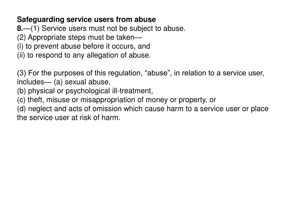 Safeguarding service users from abuse 8.—(1) Service users must not be subject to abuse. (2) Appropriate steps must be taken— (i) to prevent abuse before it occurs, and (ii) to respond to any allegation of abuse. (3) For the purposes of this regulation, “abuse”, in relation to a service user, includes— (a) sexual abuse, (b) physical or psychological ill-treatment, (c) theft, misuse or misappropriation of money or property, or (d) neglect and acts of omission which cause harm to a service user or place the service user at risk of harm.
