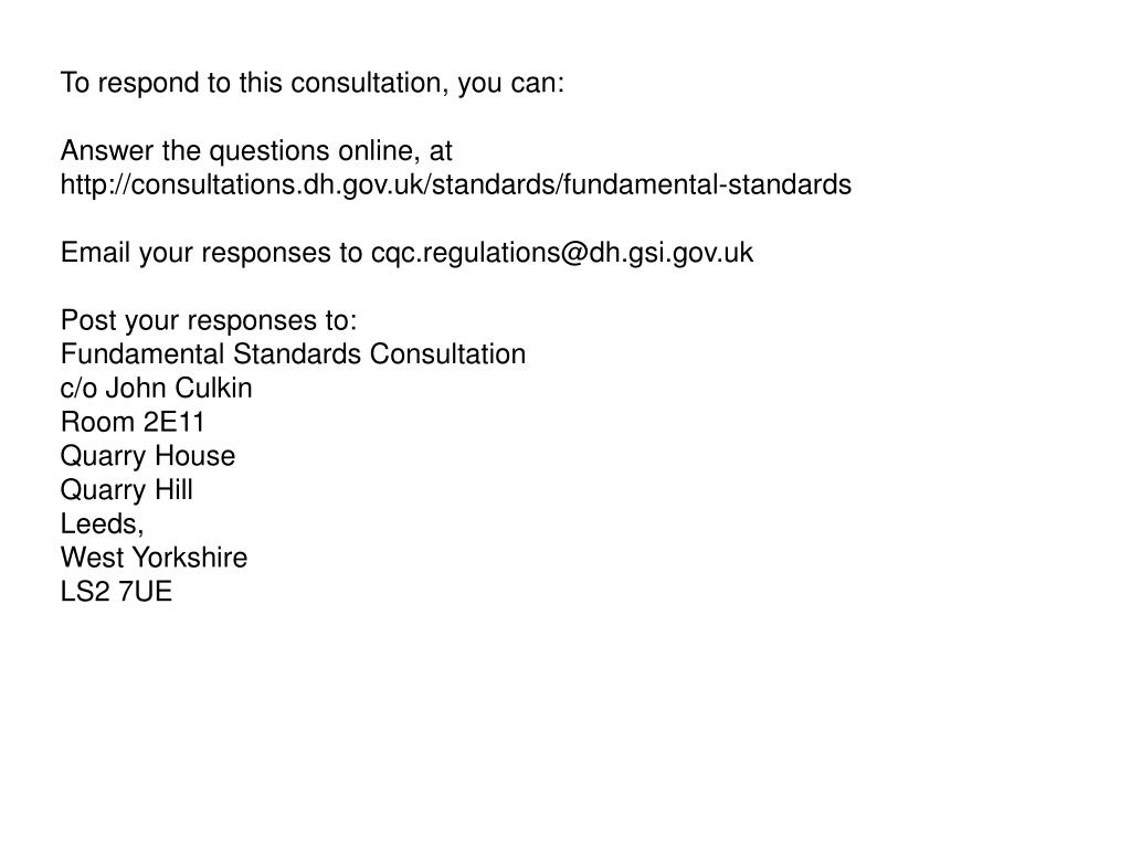 To respond to this consultation, you can: Answer the questions online, at http://consultations.dh.gov.uk/standards/fundamental-standards Email your responses to cqc.regulations@dh.gsi.gov.uk Post your responses to: Fundamental Standards Consultation c/o John Culkin Room 2E11 Quarry House Quarry Hill Leeds, West Yorkshire LS2 7UE