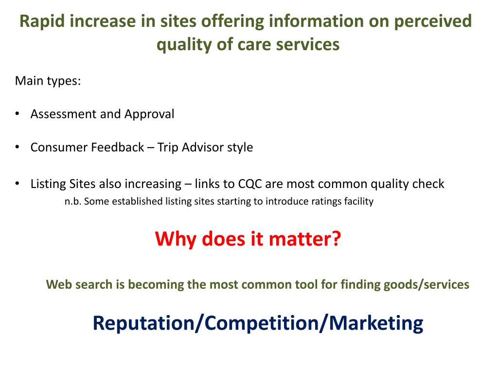 Rapid increase in sites offering information on perceived • quality of care services • Main types: • Assessment and Approval • Consumer Feedback – Trip Advisor style • Listing Sites also increasing – links to CQC are most common quality check • n.b. Some established listing sites starting to introduce ratings facility • Why does it matter? Web search is becoming the most common tool for finding goods/services Reputation/Competition/Marketing
