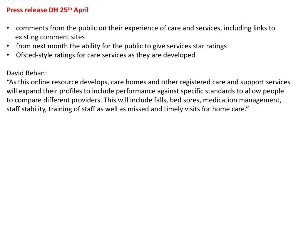 Press release DH 25th April • comments from the public on their experience of care and services, including links to • existing comment sites • from next month the ability for the public to give services star ratings • Ofsted-style ratings for care services as they are developed • David Behan: • “As this online resource develops, care homes and other registered care and support services • will expand their profiles to include performance against specific standards to allow people • to compare different providers. This will include falls, bed sores, medication management, • staff stability, training of staff as well as missed and timely visits for home care.”