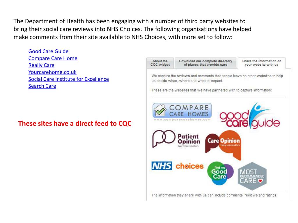 The Department of Health has been engaging with a number of third party websites to bring their social care reviews into NHS Choices. The following organisations have helped make comments from their site available to NHS Choices, with more set to follow: Good Care Guide Compare Care Home Really Care Yourcarehome.co.uk Social Care Institute for Excellence Search Care These sites have a direct feed to CQC