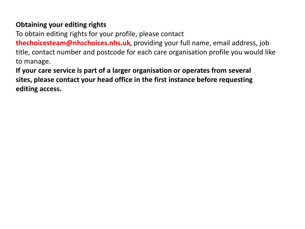 Obtaining your editing rights To obtain editing rights for your profile, please contact thechoicesteam@nhschoices.nhs.uk, providing your full name, email address, job title, contact number and postcode for each care organisation profile you would like to manage. If your care service is part of a larger organisation or operates from several sites, please contact your head office in the first instance before requesting editing access.
