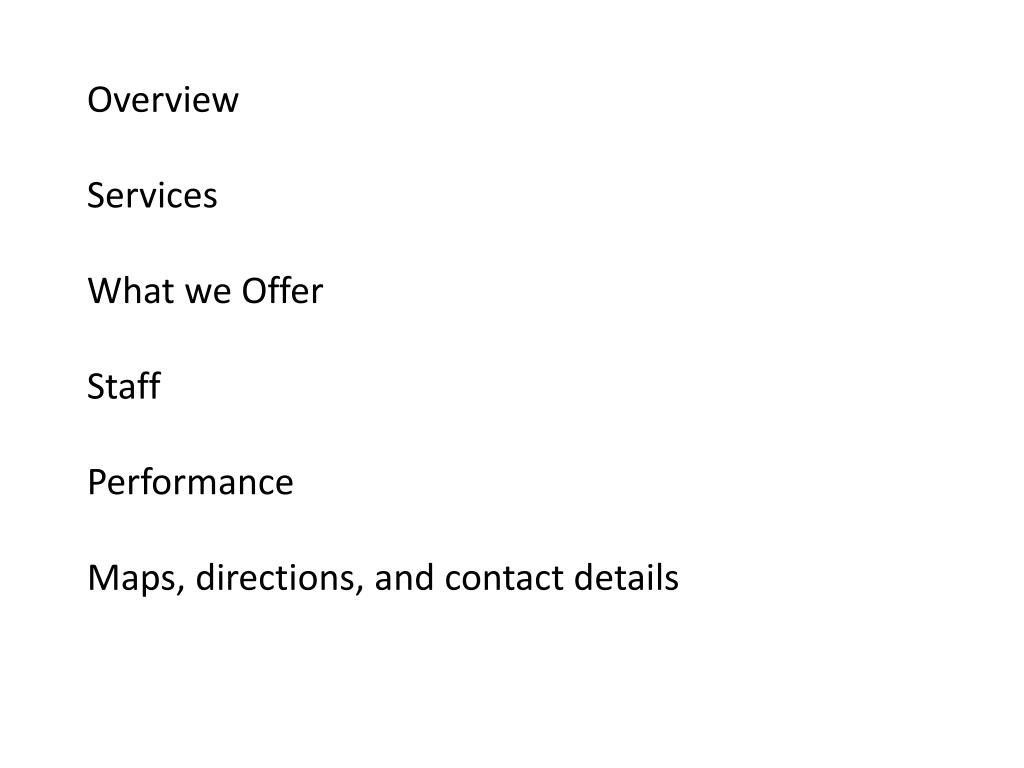 Overview Services What we Offer Staff Performance Maps, directions, and contact details