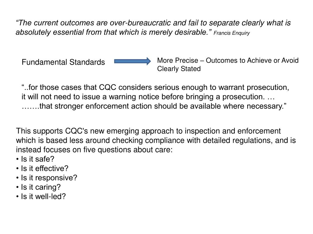 “The current outcomes are over-bureaucratic and fail to separate clearly what is absolutely essential from that which is merely desirable.” Francis Enquiry More Precise – Outcomes to Achieve or Avoid Clearly Stated Fundamental Standards “..for those cases that CQC considers serious enough to warrant prosecution, it will not need to issue a warning notice before bringing a prosecution. … …….that stronger enforcement action should be available where necessary.” This supports CQC's new emerging approach to inspection and enforcement which is based less around checking compliance with detailed regulations, and is instead focuses on five questions about care: • Is it safe? • Is it effective? • Is it responsive? • Is it caring? • Is it well-led?