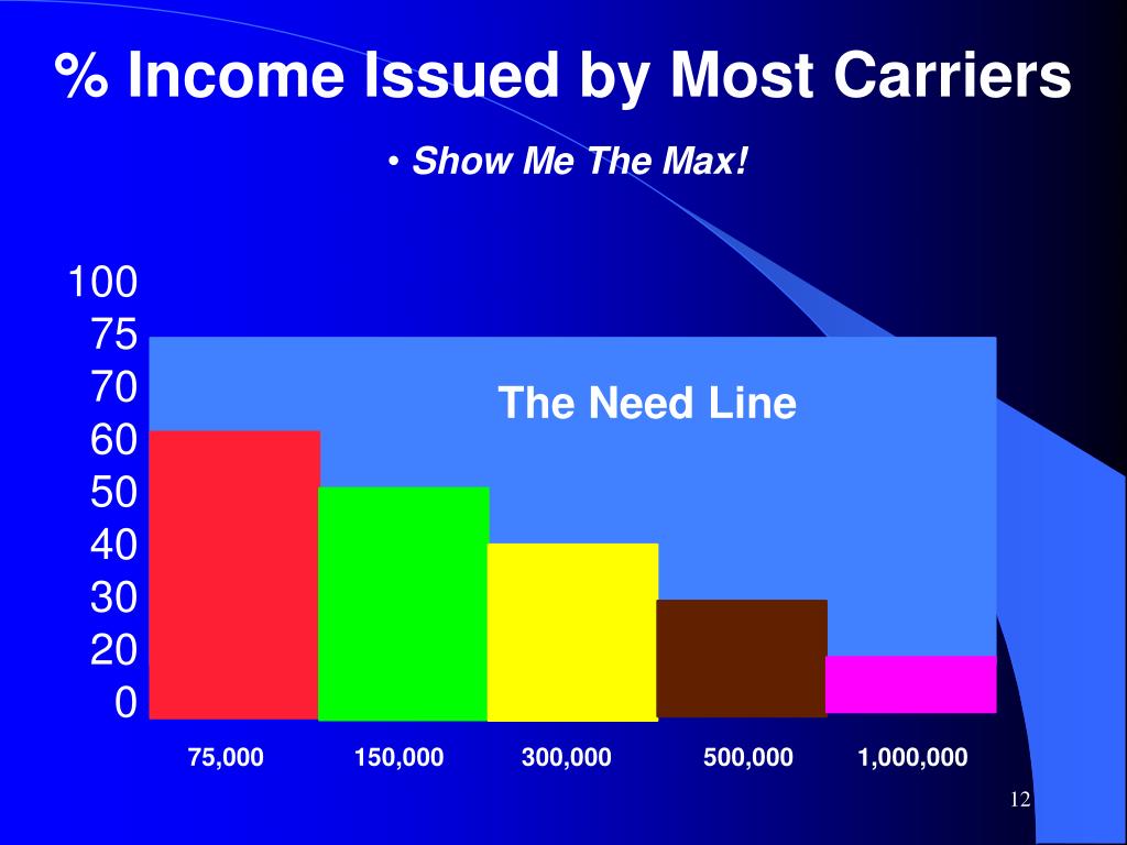 Show Me The Max! % Income Issued by Most Carriers 100 75 70 60 50 40 30 20 0 The Need Line 75,000 150,000 300,000 500,000 1,000,000