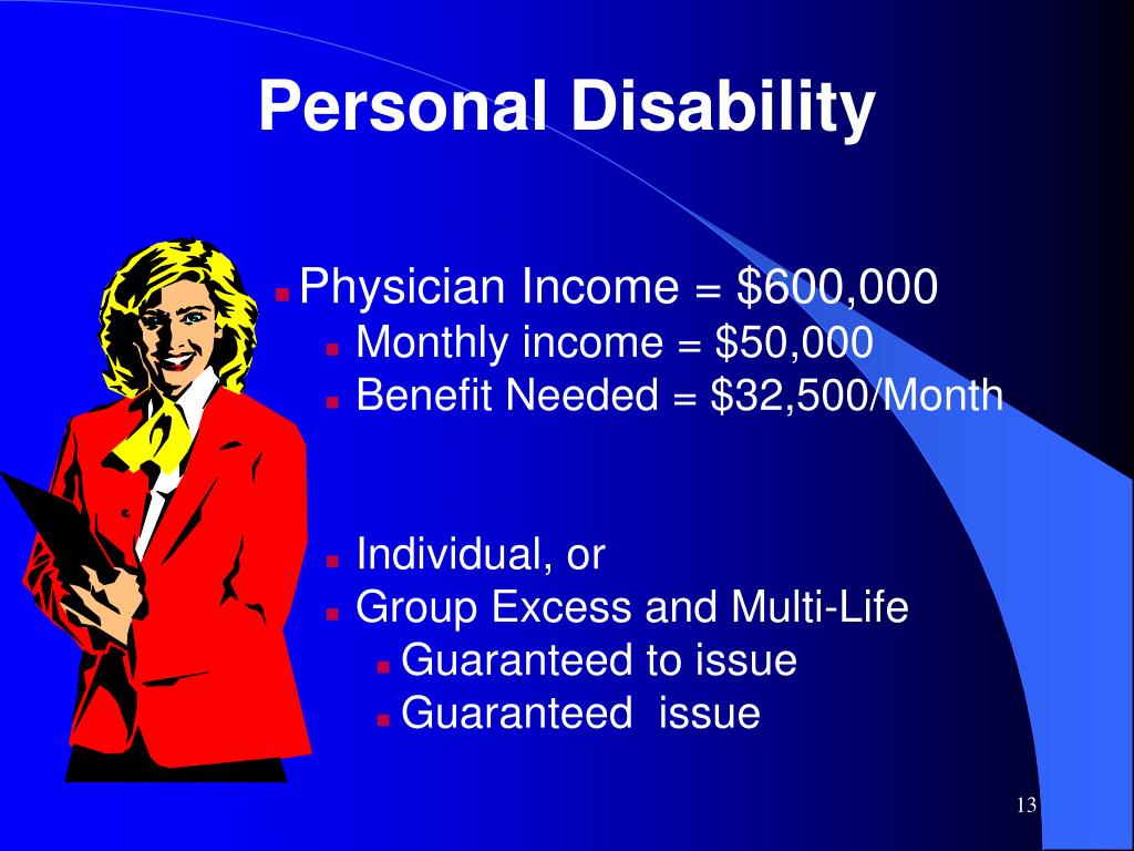 Personal Disability • Physician Income = $600,000 • Monthly income = $50,000 • Benefit Needed = $32,500/Month • Individual, or • Group Excess and Multi-Life • Guaranteed to issue • Guaranteed issue