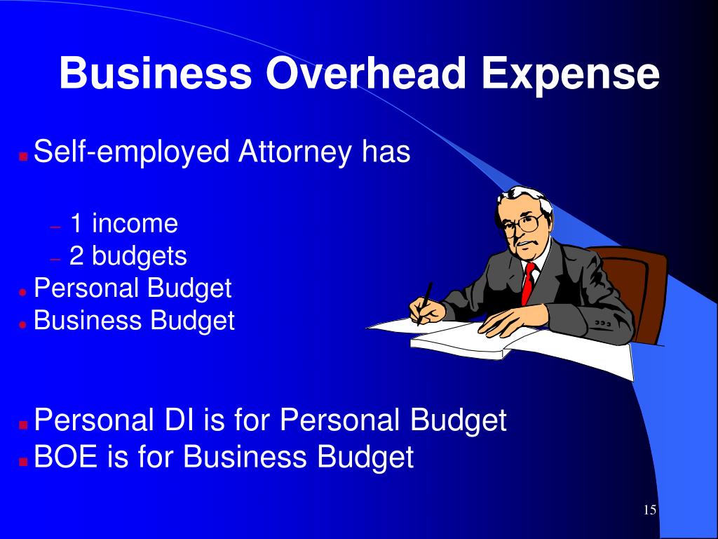 Self-employed Attorney has • 1 income • 2 budgets • Personal Budget • Business Budget • Personal DI is for Personal Budget • BOE is for Business Budget Business Overhead Expense
