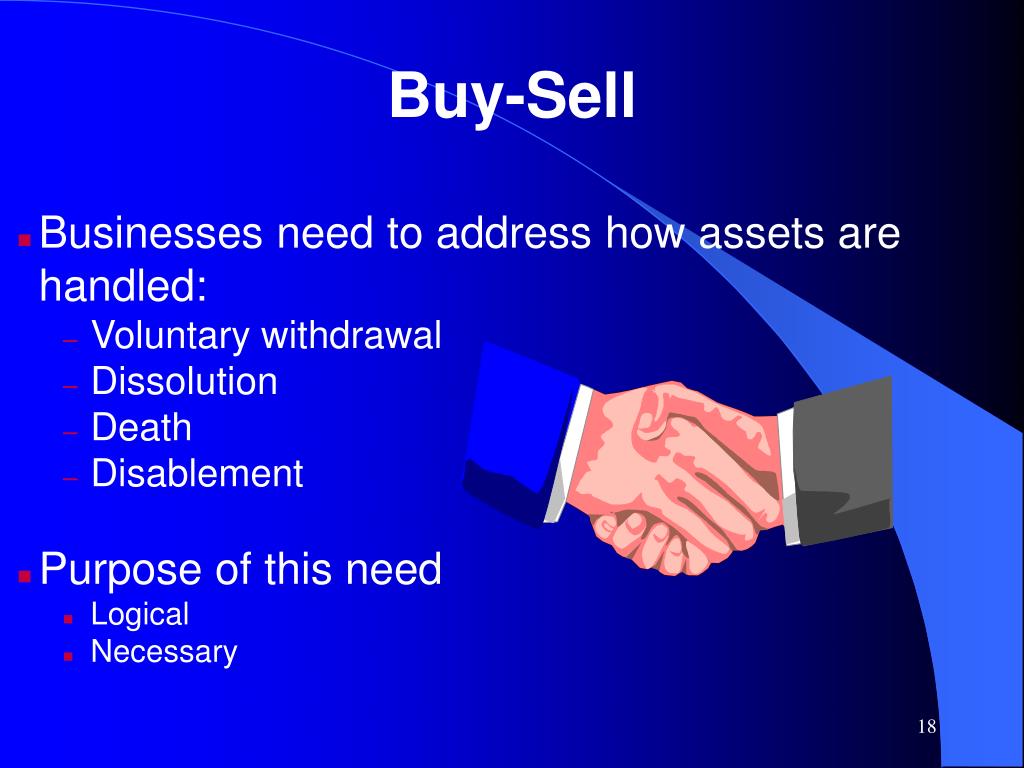 Businesses need to address how assets are handled: • Voluntary withdrawal • Dissolution • Death • Disablement • Purpose of this need • Logical • Necessary Buy-Sell