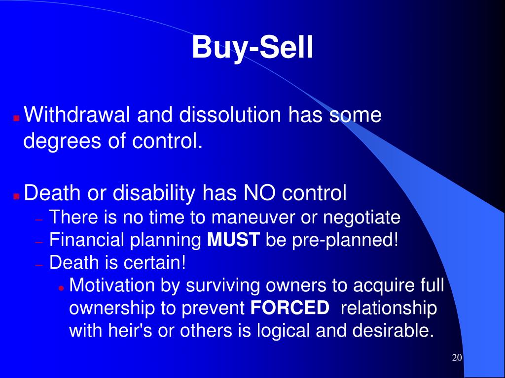 Withdrawal and dissolution has some degrees of control. • Death or disability has NO control • There is no time to maneuver or negotiate • Financial planning MUST be pre-planned! • Death is certain! • Motivation by surviving owners to acquire full ownership to prevent FORCED relationship with heir's or others is logical and desirable. Buy-Sell