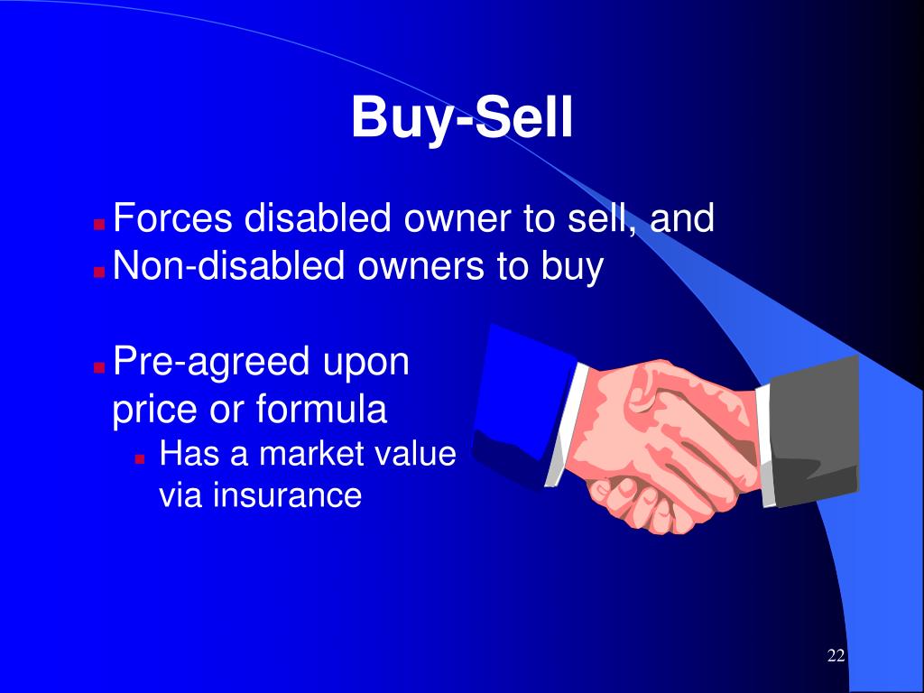 Forces disabled owner to sell, and • Non-disabled owners to buy • Pre-agreed upon price or formula • Has a market value via insurance Buy-Sell