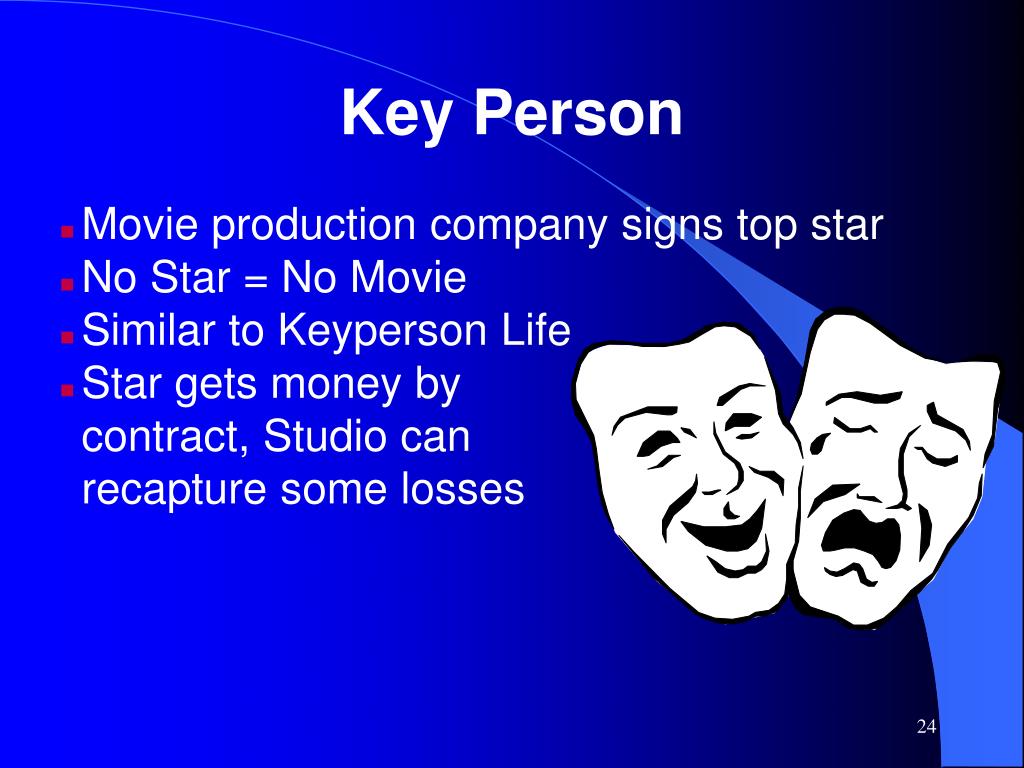 Movie production company signs top star • No Star = No Movie • Similar to Keyperson Life • Star gets money by contract, Studio can recapture some losses Key Person