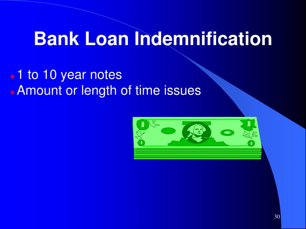 1 to 10 year notes • Amount or length of time issues Bank Loan Indemnification