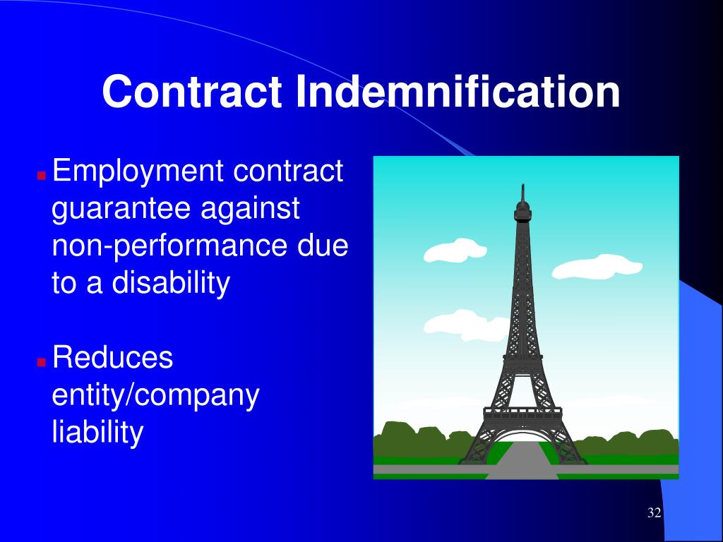 Employment contract guarantee against non-performance due to a disability • Reduces entity/company liability Contract Indemnification