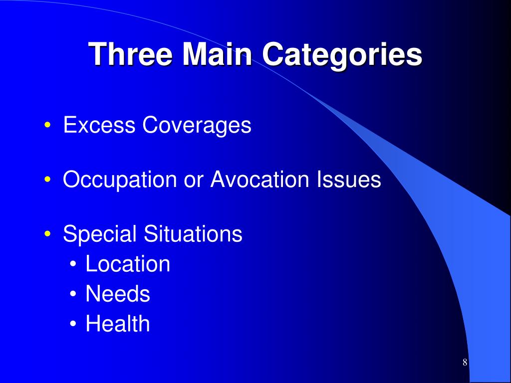 Three Main Categories • Excess Coverages • Occupation or Avocation Issues • Special Situations • Location • Needs • Health