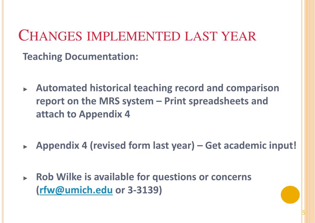 Changes implemented last year Teaching Documentation: • Automated historical teaching record and comparison report on the MRS system – Print spreadsheets and attach to Appendix 4 • Appendix 4 (revised form last year) – Get academic input! • Rob Wilke is available for questions or concerns (rfw@umich.eduor 3-3139) 5