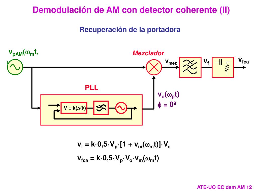 Mezclador vmez vpAM(wmt, wpt) vo(wot) Demodulación de AM con detector coherente (I) Principio de operación Recuerdese: cosA·cosB = 0,5[cos(A+B) + cos(A-B)] vf Señales de entrada: vpAM(wmt, wpt) = Vp·[1 + vm(wmt)]·cos(wpt) vo(wot) = Vo·cos(wot + f) Salida del mezclador: vmez = k·0,5·Vp·[1 + vm(wmt)]·Vo·[cos[(wp + wo)t + f] + cos[(wo - wp)t + f]] Salida del filtro: vf = k·0,5·Vp·[1 + vm(wmt)]·Vo·[cos[(wo - wp)t + f]] Si la señal del oscilador coincide en frecuencia y fase con la portadora, es decir,wo = wpyf = 0º, entonces: vf = k·0,5·Vp·[1 + vm(wmt)]·Voque es proporcional a vm(wmt) + unacomponente de continua, que se elimina como en el detector de envolvente ¿Cómo conseguirwo = wpyf = 0º? ATE-UO EC dem AM 11