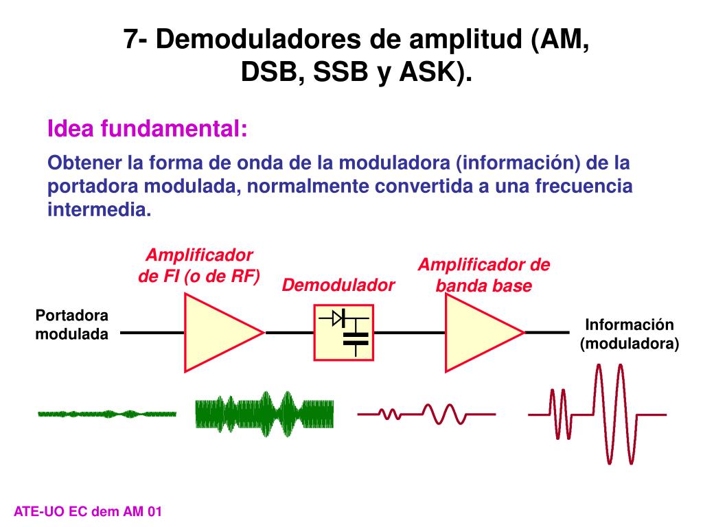 Amplificador de FI (o de RF) Amplificador de banda base Demodulador Portadora modulada Información (moduladora) 7- Demoduladores de amplitud (AM, DSB, SSB y ASK). Idea fundamental: Obtener la forma de onda de la moduladora (información) de la portadora modulada, normalmente convertida a una frecuencia intermedia. ATE-UO EC dem AM 01