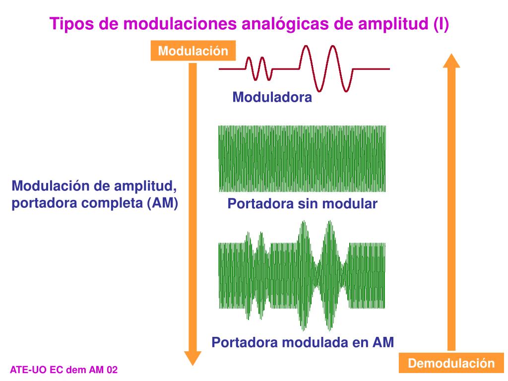 Modulación Moduladora Portadora sin modular Portadora modulada en AM Demodulación Tipos de modulaciones analógicas de amplitud (I) Modulación de amplitud, portadora completa (AM) ATE-UO EC dem AM 02