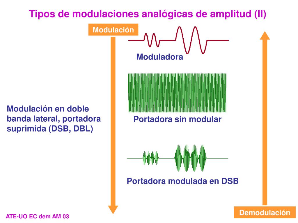 Modulación Moduladora Portadora sin modular Portadora modulada en DSB Demodulación Tipos de modulaciones analógicas de amplitud (II) Modulación en doble banda lateral, portadora suprimida (DSB, DBL) ATE-UO EC dem AM 03