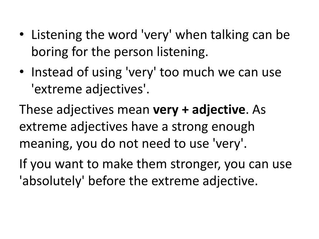 Listeningtheword 'very' whentalking can be boringforthepersonlistening. • Instead of using 'very' toomuchwe can use 'extreme adjectives'. Theseadjectives mean very + adjective. As extreme adjectiveshave a strongenoughmeaning, you do notneedto use 'very'. Ifyouwanttomakethemstronger, you can use 'absolutely' beforethe extreme adjective.