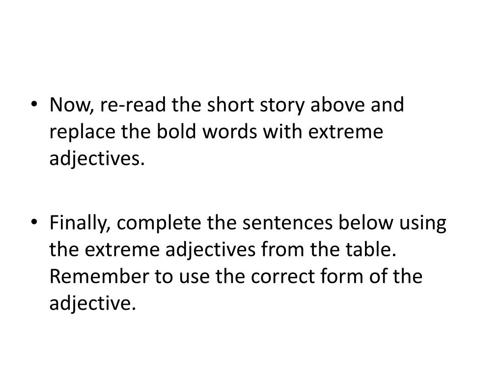 Now, re-readthe short storyabove and replacetheboldwordswith extreme adjectives. • Finally, complete thesentencesbelowusingthe extreme adjectivesfromthetable. Rememberto use thecorrectform of theadjective.