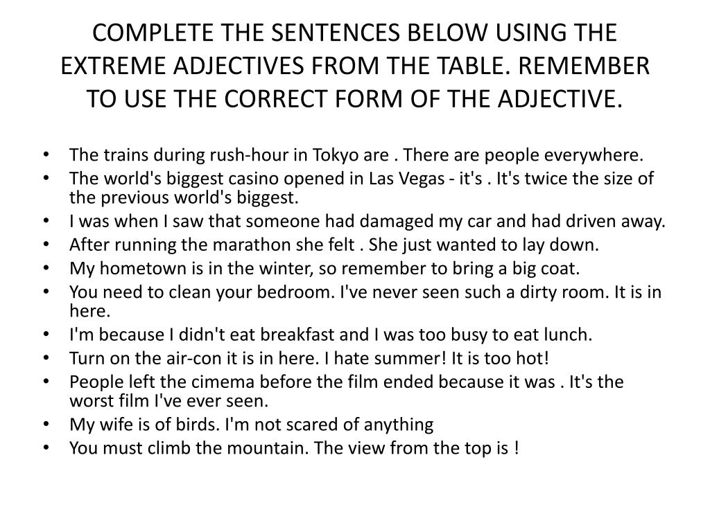 COMPLETE THE SENTENCES BELOW USING THE EXTREME ADJECTIVES FROM THE TABLE. REMEMBER TO USE THE CORRECT FORM OF THE ADJECTIVE. • The trains during rush-hour in Tokyo are . There are people everywhere. • The world's biggest casino opened in Las Vegas - it's . It's twice the size of the previous world's biggest. • I was when I saw that someone had damaged my car and had driven away. • After running the marathon she felt . She just wanted to lay down. • My hometown is in the winter, so remember to bring a big coat. • You need to clean your bedroom. I've never seen such a dirty room. It is in here. • I'm because I didn't eat breakfast and I was too busy to eat lunch. • Turn on the air-con it is in here. I hate summer! It is too hot! • People left the cimema before the film ended because it was . It's the worst film I've ever seen. • My wife is of birds. I'm not scared of anything • You must climb the mountain. The view from the top is !