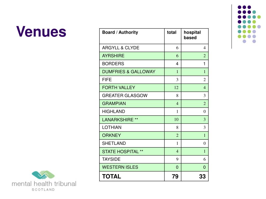 Security • Suggested policy • Patient remains under care and supervision of hospital escort if subject to detention • Public liability remains with venue • Scottish Exec responsible for tribunal members and MHTS staff • MHTS will assess risk with input from MHO • Additional security arrangements made on basis of risk assessment • Setting up security protocols with police • Reviewing suitability of subset of venues for higher risk hearings with police • Clerks will be have “Breakaway” training